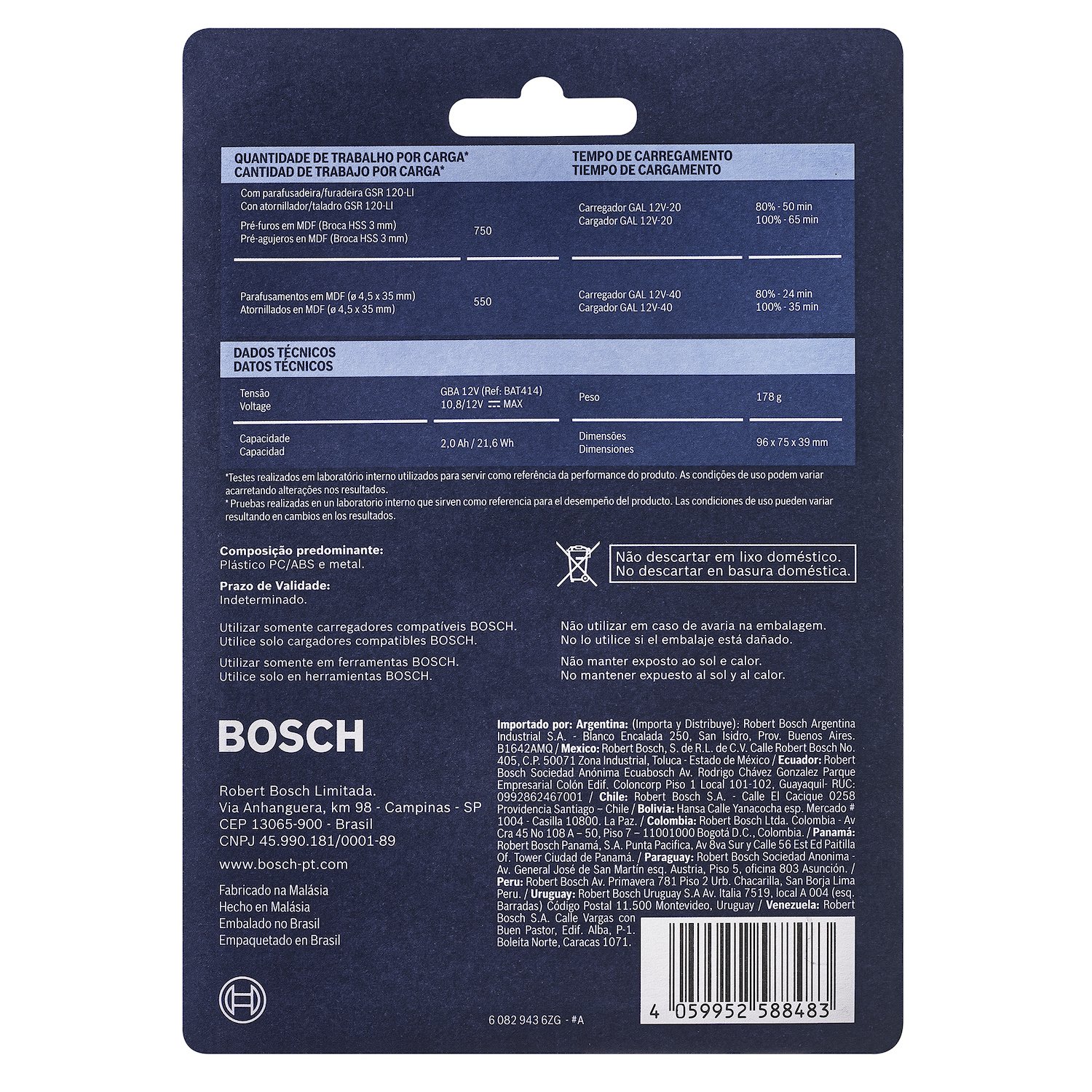 A Bateria Bosch 12V GBA 12V possui capacidade de 2,0Ah.