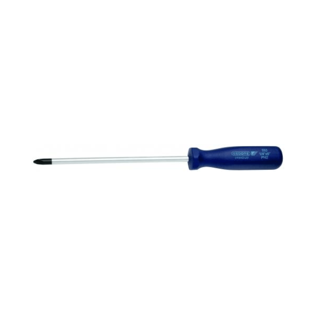 Haste em aço Gedore-Vanadium e cabo em polímero na cor azul padrão Gedore. Haste com acabamento niquelado e cromado, com ponta escurecida. Cabo ergonômico. Chave com haste redonda e resistente, com perfil de encaixe para parafusos tipo fenda cruzada “Phillips”.