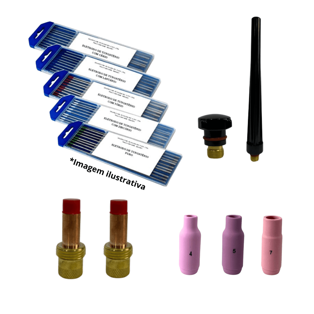 Este kit reúne os principais componentes de reposição para tochas TIG.