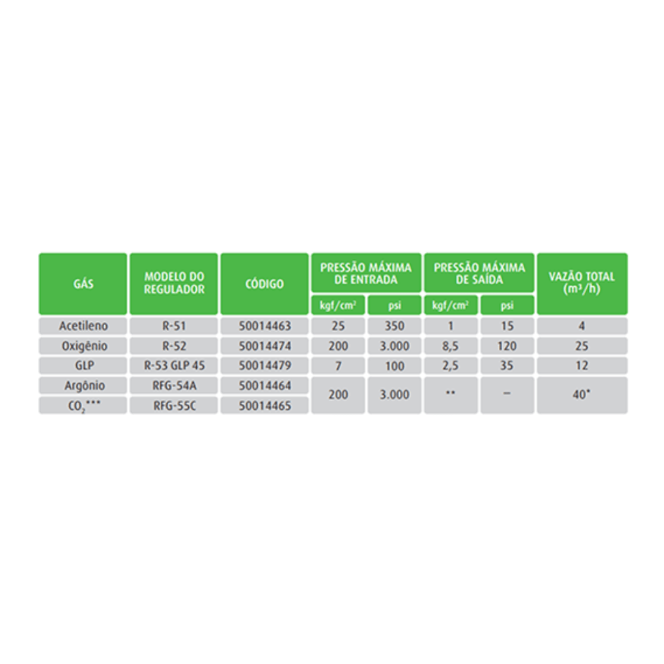 Os reguladores R-51 Acetileno, R-52 Oxigênio e R-53 GLP 45 são para uso nos processos de soldagem, aquecimento e corte oxicombustíveis.